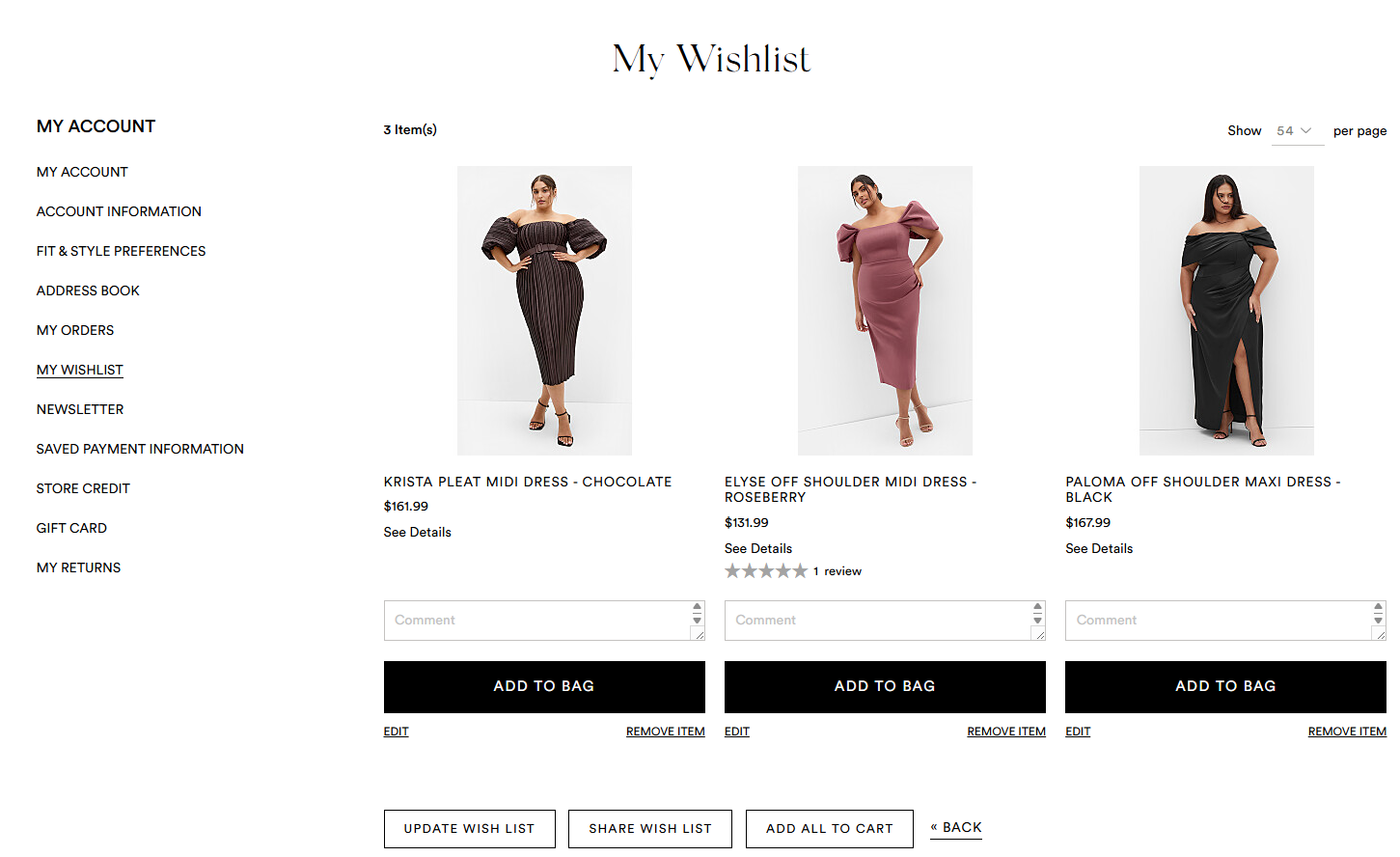 Make sure you are logged in to your City Chic Online account. On each garment page, click the 'Add To Wishlist' button below select a size.Once added to your Wishlist you can amend, add the item to your cart or even send the Wishlist to someone!